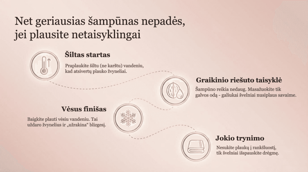 Net geriausi šampūnai neduos rezultato, jei plaukai plaunami neteisingai. Štai keletas patarimų: