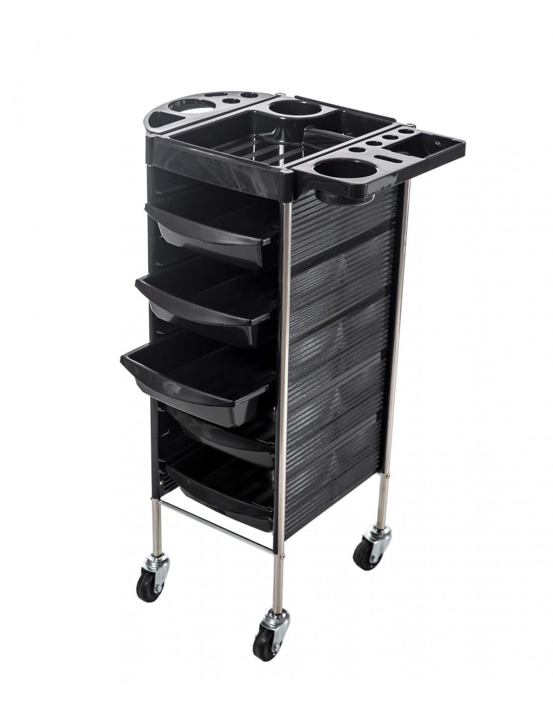 Vežimėlis turi net 5 talpius stalčius, leidžiančius patogiai susidėlioti kirpimo mašinėles, šepečius, šukas, kosmetiką ir kitus darbo įrankius. Dvi sulankstomos šoninės lentynos suteikia papildomos vietos plaukų džiovintuvui ar dažymo priemonėms, o prireikus jas galima lengvai nulenkti.