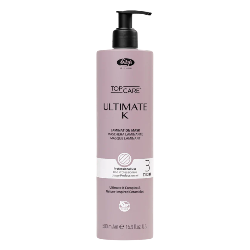 Lisap Ultimate K Step 3 laminuojanti kaukė keratino tiesinimui, 500 ml – profesionali plaukų priežiūros priemonė, naudojama kaip trečiasis keratino tiesinimo procedūros etapas. Ši kaukė sukurta tam, kad užfiksuotų procedūros rezultatą, uždarytų plauko kutikulę ir suteiktų plaukams ilgalaikį glotnumą, švelnumą bei natūralų žvilgesį.