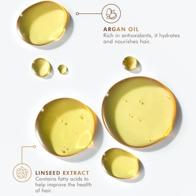 Formulėje esantis antioksidantais turtingas argano aliejus bei linų sėmenų ekstraktas padeda atkurti pažeistų plaukų struktūrą, apsaugo nuo išsausėjimo ir suteikia švelnumo bei elastingumo. Aliejukas efektyviai mažina pasišiaušimą, palengvina iššukavimą ir modeliavimą, o taip pat veikia kaip terminė apsauga džiovinant ar tiesinant plaukus. Plaukai tampa glotnūs, šilkiniai ir įgauna sveiką, natūralų blizgesį be riebumo pojūčio.
